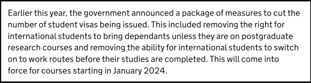 留学新闻 | 2024英国留学签证政策大调整英国留学 2023年5月以来, 英政府陆续宣布多项将于2024年开始实施的英国留学相关签证新规。今天小编就带大家来看看,今年学生签证政策将作出哪些重大调整。 01 结业前不能换工签 2 “PSW”审核更严格 3 签证费涨价 4 医疗附加费涨价 5 限制陪读签证 6 毕业申工签门槛提升 |